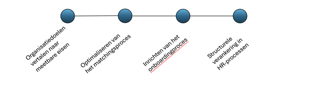 - We richten het onboardingproces in, met een directe koppeling van functievereisten en bedrijfscultuur/ afdelingscultuur met persoonlijke drijfveren en talenten.